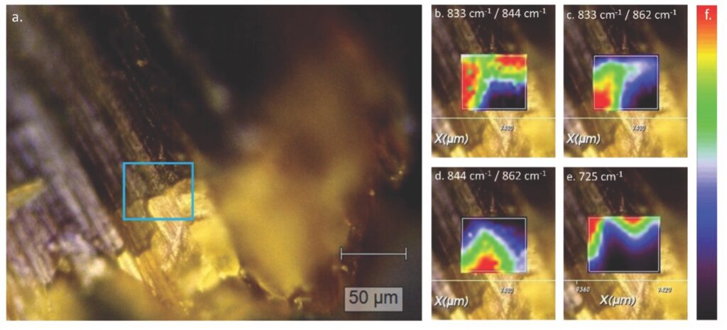 Figure 6. (a) Optical image showing the transition region of an aggregate of crystals from the 357 ianthinite specimen, progressing from dark violet (less altered) to golden–yellow (more altered). 358 (b) Intensity ratio map comparing spectroscopic features at 833 and 844 cm–1. This map 359 indicates that the feature at 833 cm–1 is more prominent in unaltered ianthinite. (c) Intensity ratio 360 map comparing features at 833 and 862 cm–1 the 833 cm–1 feature remains fairly prominent, 361 further indicating that this feature originates from unaltered ianthinite. (d) Intensity ratio map 362 comparing features at 844 and 862 cm–1, showing that features in this region are more closely 363 associated with alteration phases of ianthinite. (e) Intensity map of a peak centered at 725 cm–1, 364 with higher intensity associated with unaltered ianthinite.