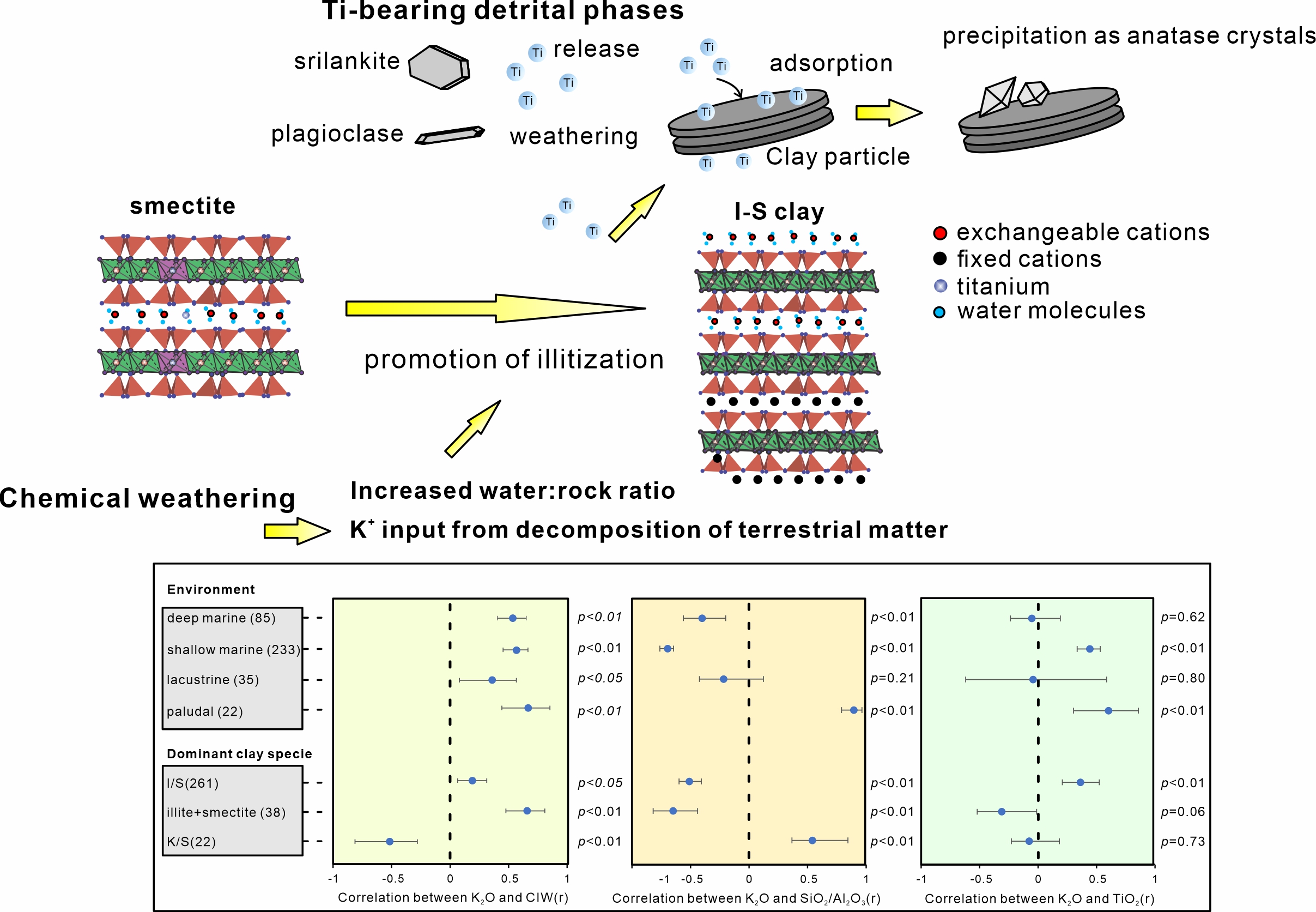 Through investigation of the fine structure of clay minerals and in-situ nano-mineralogy of Ti-bearing minerals from K-bentonite and meta-analysis of geochemical compositional data compilation of 384 K-bentonite layers with a global distribution, Liu et al. discovered that chemical weathering could promote the illitization reaction, which may jointly influence the formation of Ti oxides. Interstratified illite-smectite can adsorb Ti during the weathering and provide a suitable site for the nucleation of anatase and enrichment of titanium. This study unravels the role of chemical weathering in the illitization of smectite and its effect on the formation of Ti oxides. The comprehensive dataset advances our understanding on the formation of interstratified illite-smectite, illitization process, and related geochemical cycling in sedimentary systems. The coupling revealed in this study represents a linkage between sedimentary-basin evolution, environmental change, clay-mineral transformation, and nano-mineral neoformation.