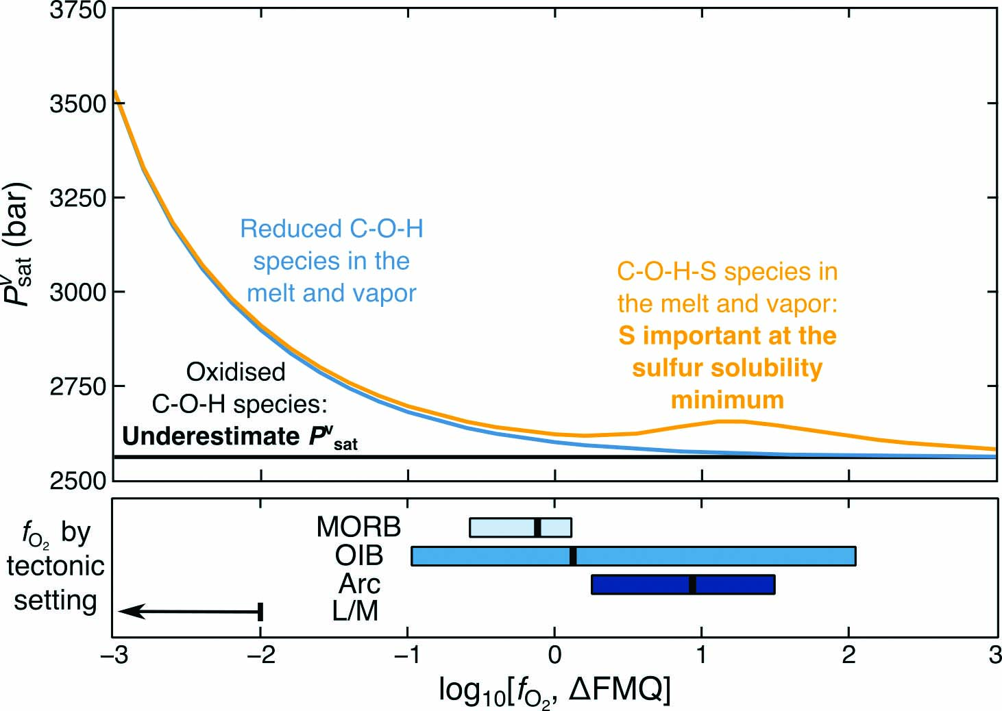 The volatile content of the melt can be used as a barometer if the melt is vapor-saturated (pressure of vapor-saturation: Pvsat). Most Pvsat calculations assume the melt and vapor contain only oxidized C-O-H species. Hughes et al. show that the exclusion of reduced C-O-H species results in large Pvsat underestimations at reduced conditions while excluding S causes underestimates of Pvsat at intermediate redox conditions. Hence, magma depths are deeper than previously calculated at these conditions.