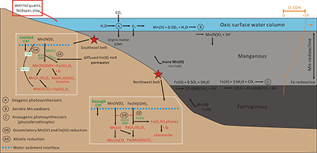 The traditional view suggests that the presence of Mn(II) carbonates in manganese deposits was formed by the diagenetic reduction of precursor Mn(IV) oxides. Therefore, Precambrian sedimentary Mn deposits have been used to indicate the evolution of oxygen in Earth�s surface environments. However, recent studies have shown that these Mn(II) carbonates can directly accumulate within anoxic water columns, casting uncertainty on the robustness of using ancient Mn deposits to constrain the redox fabric of the past marine water columns. Based on the comprehensive mineralogical investigation of the Mesoproterozoic Wafangzi Mn-Fe deposit, Yan et al. suggest that the Mn(II,III)- and Fe(II)-bearing mineral phases were formed through the diagenetic reduction of primary Mn(IV) and Fe(III) minerals, supporting the traditional oxygenation metallogenic model. Together with contemporaneous Mn mineralization in western Australia, their study supports a continent-scale transient pulsed oxygenation event in the mid-Proterozoic oceans. Their findings shed light on the interaction between Mn cycles and oceanic redox environment in the critical �boring billion� earth history.