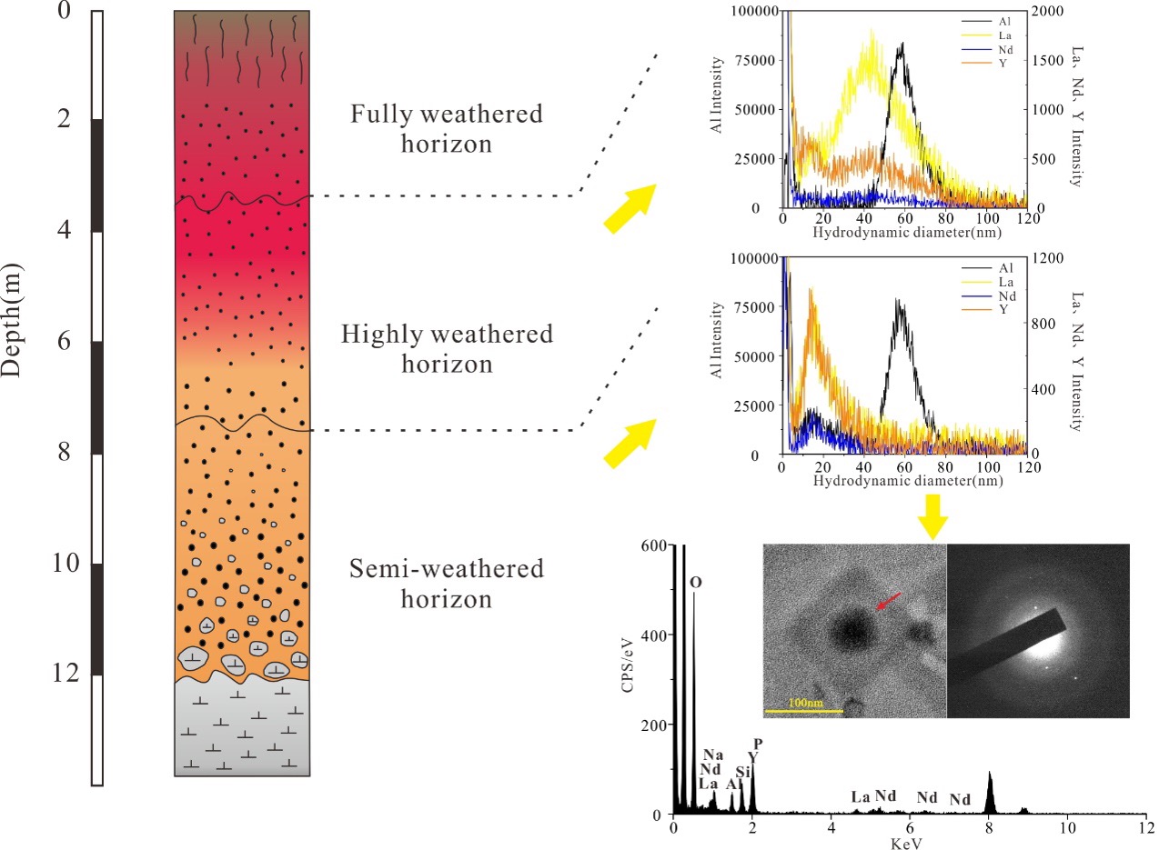 Yi et al. used hollow fiber flow field-flow fractionation and inductively coupled plasma-mass spectrometry, scanning, and transmission electron microscopy to characterize the REE nano-particles in different granite regolith horizons (?REEmax = 1201 ppm) and the association between REEs and clay minerals. Two different types of REE-bearing nano-particles were observed: Ce oxides which are mainly enriched in the upper horizon and occur as cerite, and amorphous La, Nd, and Y phosphates, which are mainly enriched in the lower horizons. These nano-particles are commonly attached to the surfaces of clay minerals. Compared with platy kaolinite, tubular halloysite occurs mainly in the lower horizons, has a higher adsorption capacity for the REEs, and thus is responsible for the REE enrichment in ion adsorption-type REE deposits. The findings indicate that there are various types of nano-minerals and -particles that affect REE enrichment and fractionation during granite weathering.