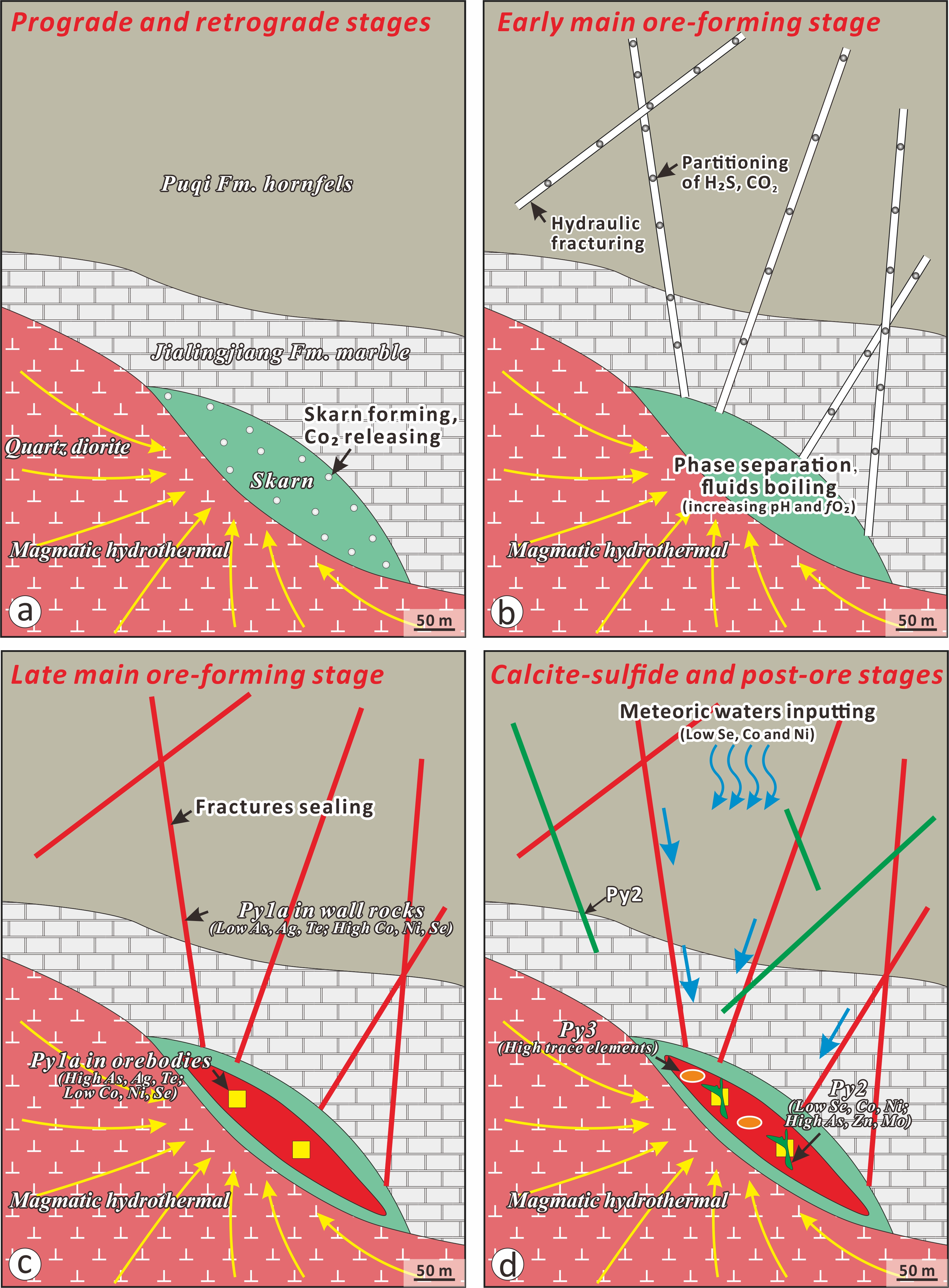 This study by Zhang et al. highlights the significance of wallrock hydraulic fracturing, fluid-rock reaction, and the fluid physicochemical evolution in the skarn ore-forming process, and suggests the potential use of pyrite trace element geochemistry for exploring Au-Cu skarn mineral systems.