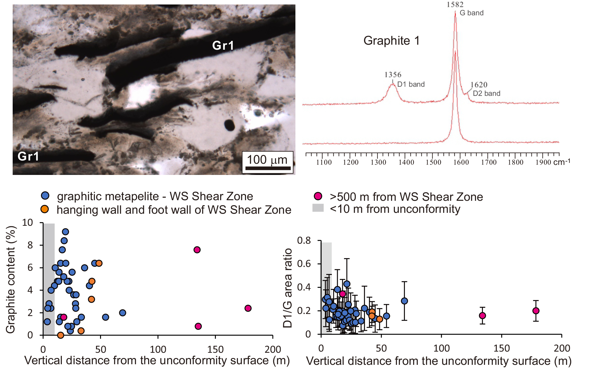 Unconformity-related uranium (URU) deposits in the Proterozoic Athabasca Basin (Canada) represent the richest and one of the most important uranium endowments in the world. Song et al. use the Phoenix uranium deposit in the southeastern Athabasca Basin as a case study to address the association of URUs with graphitic basement faults. Petrographic studies indicate that there is no direct contact between graphite and uraninite at microscopic scales, and the content of graphite in the graphitic metapelite along the ore-controlling WS Shear Zone does not show a systematic change with the distance from the unconformity surface. Raman spectroscopic studies of graphite suggest that the degree of structural disorder of graphite does not change systematically with the distance from the unconformity surface either. The minor irregularities in these parameters near the unconformity are better explained by paleo-weathering related to the unconformity and/or diagenetic processes than by hydrothermal activity related to uranium mineralization. Based on these observations and interpretations, the role of graphite as an in situ reducing agent, either directly or as a provider of hydrocarbons, is discounted. It is proposed that hydrocarbons derived from graphite at depth, tapped by episodic reactivation or seismicity of the basement faults that were facilitated by graphite as a lubricant, were responsible for URU mineralization.