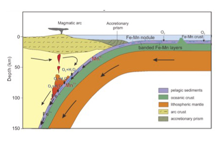 Song et al. investigated high-pressure metamorphosed Mn-rich cherts in ancient seafloors in the Qilian subduction zone, and demonstrated that reductive reactions of Mn-rich cherts in the subduction zone are an important factor for mantle wedge oxidization and oxygen recirculation. They propose that the oxygen flux generated by progressive metamorphism of Mn-rich pelagic sediments is high enough for oxidizing the sub-arc mantle, while the ferric iron plays very little role in the oxidization of the sub-arc mantle wedge.