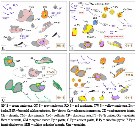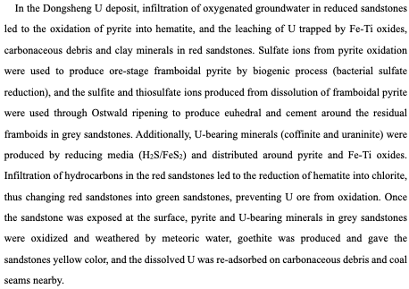 Yue et al. observe six main Fe-bearing minerals including biotite, Fe-Ti oxides, pyrite, hematite, goethite, and chlorite in four different colored sandstones. Mobilization and fixation of U are associated with alteration processes of Fe-bearing minerals. Paragenetic relationships and sulfur isotopic compositions of ore-stage pyrite suggest two distinct mechanisms for U mineralization.