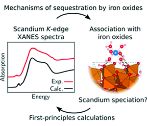 Chassé et al. investigate the mechanisms of scandium sequestration by iron oxides combining first-principles calculations with X-ray absorption near-edge structure spectroscopy. Their results show the specificities of scandium sorption processes, explaining its concentration in iron-oxide rich surficial environment, with implications for mineral processing. This work demonstrates the relevance of the approach to study the speciation of trace metals in the environment.