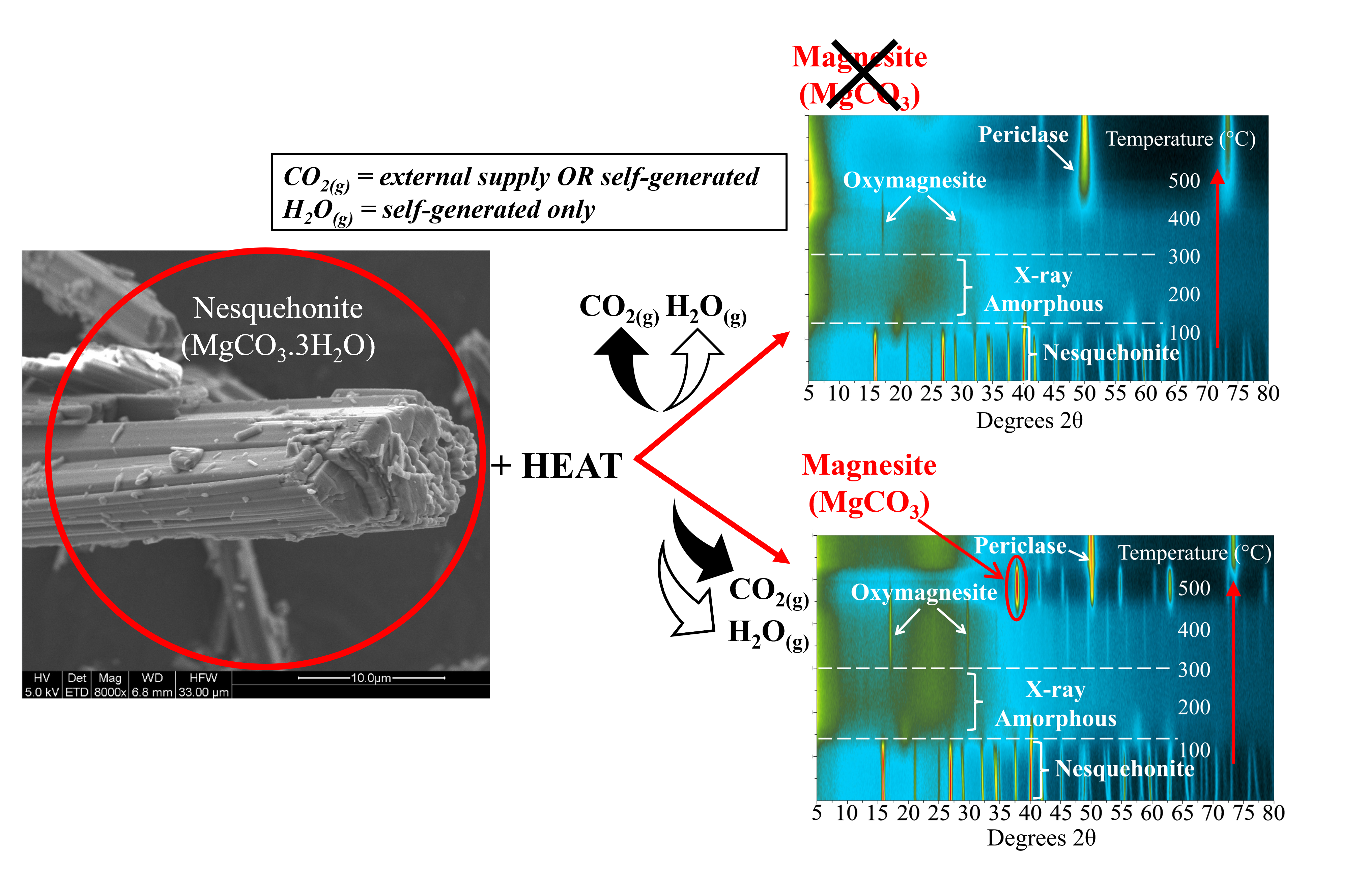 Magnesite formation mechanisms via crystalline and amorphous phases and the implications for CO2 storage security are poorly resolved. Morgan et al. find that more magnesite forms from nesquehonite when self-generated gases are retained or external CO2 is supplied. The data suggest dehydration-crystallization likely drives magnesite formation; however, solid-gas reactions may also be important in closed-system experiments. The authors propose a novel method to quantify amorphous phases in the system, which are dominant CO2 stores that are often not considered in carbon accounting.